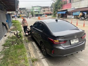 พร้อมสายตรวจจราจร เข้าช่วยเหลือประชาชน เนื่องจากบังโคลนติดล้อรถยนต์ ณ หน้าโรงเรียนบ้านนาข่อย