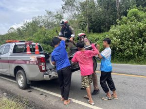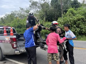 พร้อมสายตรวจจราจร เข้าช่วยเหลือประชาชน เนื่องจากน้ำมันหมดระหว่างเดินทาง จึงได้เข้าช่วยเหลือ นำไปส่งร้านปั้มน้ำมัน ณ หมู่ที่ 2 ต.ยะรม อ.เบตง จ.ยะลา