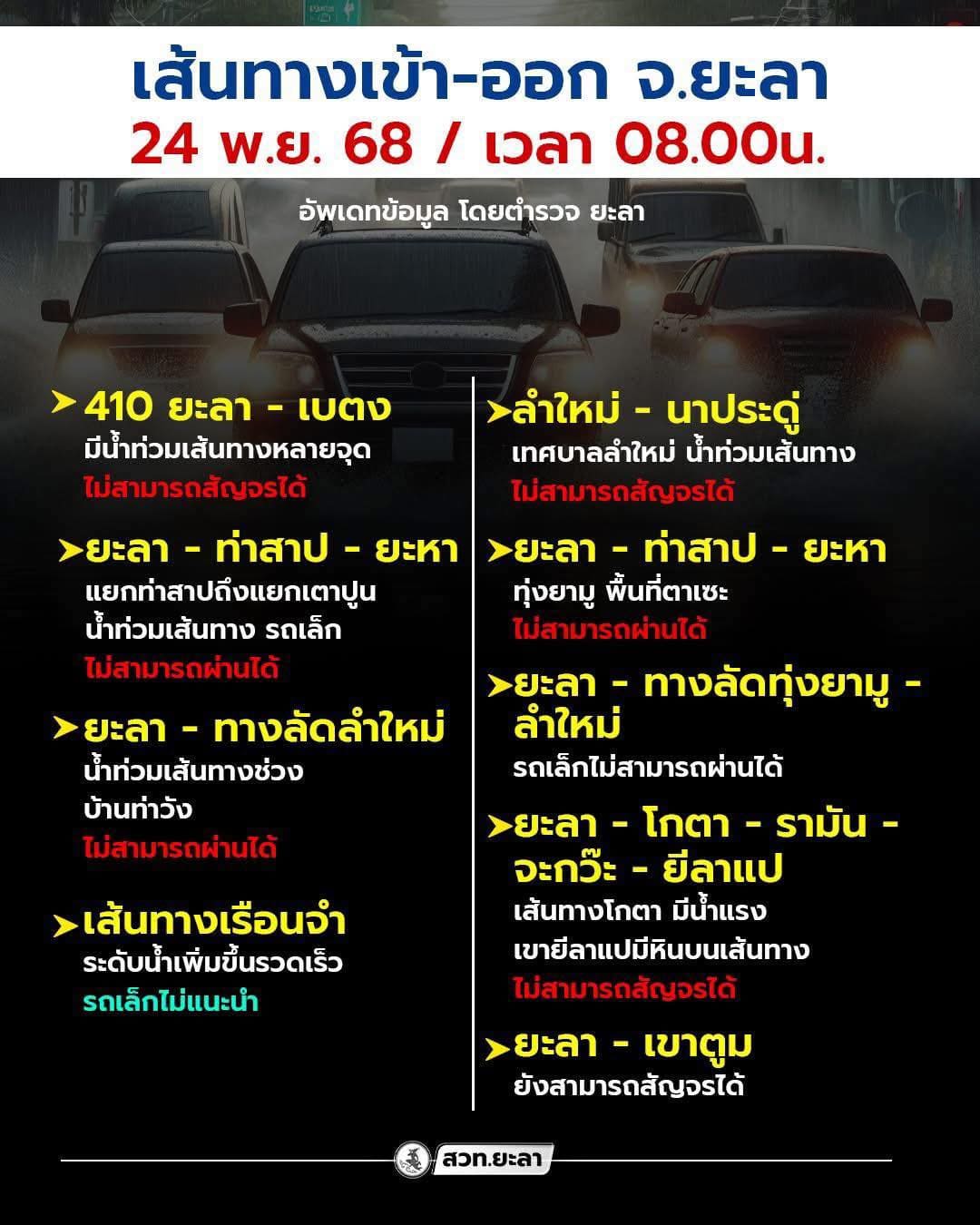 เช็คเส้นทางเข้า-ออก จังหวัดยะลา ณ เวลานี้ รวบรวมมาให้แล้ว ส่วนใหญ่ สัญจรไม่ได้แล้ว 24 พ.ย.68 เวลา 08