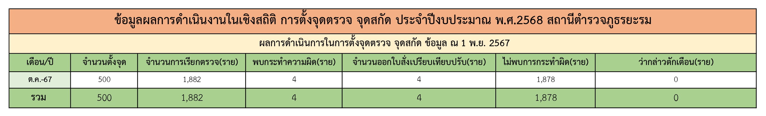 ข้อมูลผลการดำเนินงานในเชิงสถิติ การตั้งจุดตรวจ จุดสกัด เดือน ตุลาคม 2567