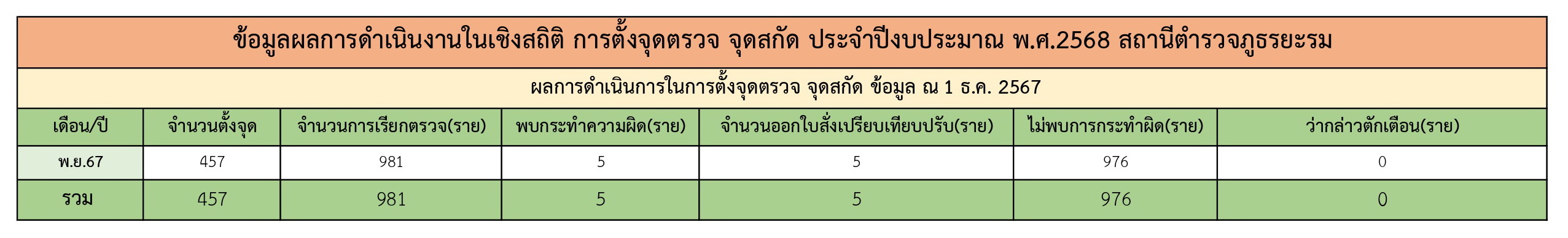 ข้อมูลผลการดำเนินงานในเชิงสถิติ การตั้งจุดตรวจ จุดสกัด เดือน พฤศจิกายน 2567