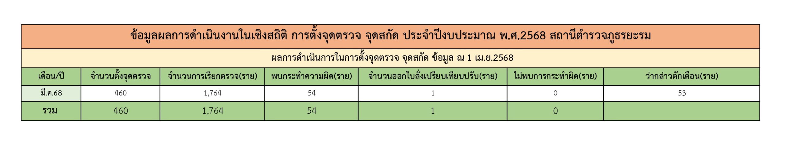 ข้อมูลผลการดำเนินงานในเชิงสถิติ การตั้งจุดตรวจ จุดสกัด เดือน มีนาคม 2568